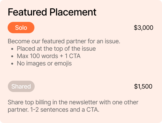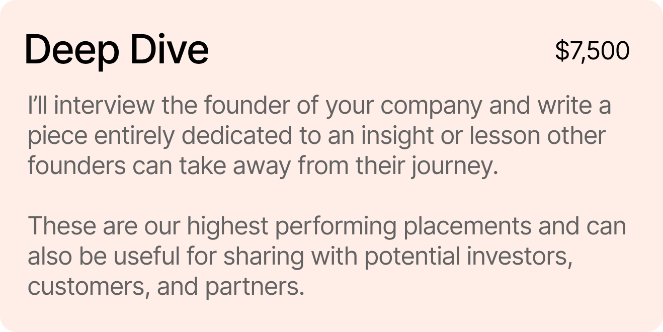 Your placement will run at 7:00am EST on the date you selected.If you booked a deep dive, I will reach out to set up an interview.Otherwise you are responsible for the first draft of copy for the ad. Please send it to max@houck.news no later than 1 week before your spot is scheduled to run.Once I receive the copy from you, I may edit it in my voice to maximize conversion.